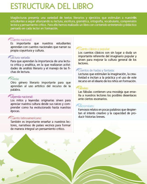 Magilecturas presenta una variedad de textos literarios y ejercicios que estimulan a nuestros(as) estudiantes a seguir afianzando su lectura, escritura, gramática, ortografía, vocabulario, comprensión lectora y pensamiento crítico. Para ello hemos realizado un libro de contenido entretenido y didáctico pensado en cada lector en formación.