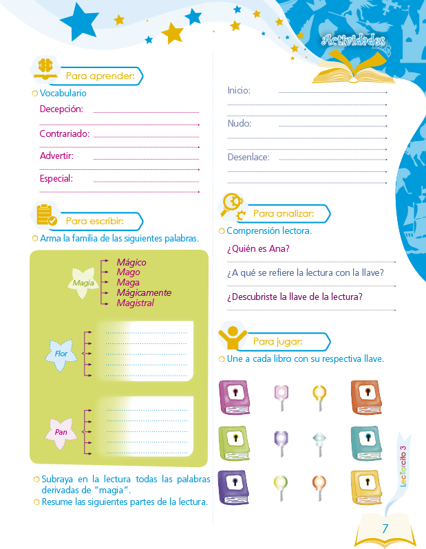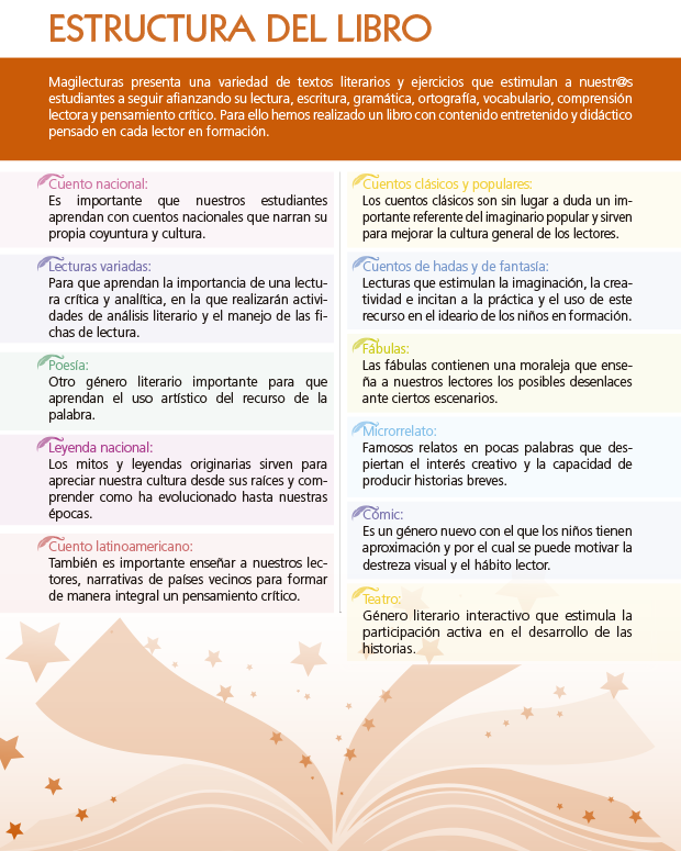 Magilecturas presenta una variedad de textos literarios y ejercicios que estimulan a nuestros(as) estudiantes a seguir afianzando su lectura, escritura, gramática, ortografía, vocabulario, comprensión lectora y pensamiento crítico. Para ello hemos realizado un libro de contenido entretenido y didáctico pensado en cada lector en formación.